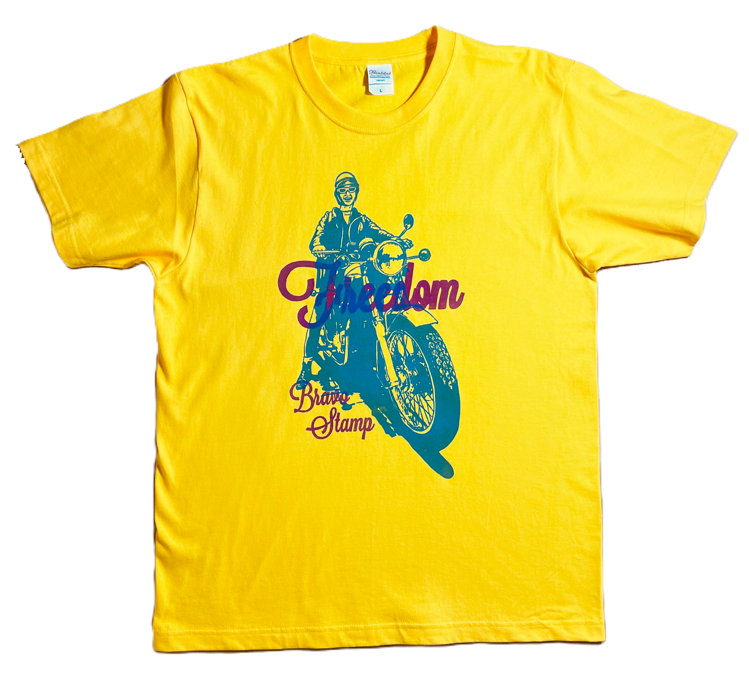 目を引くイエローのボディに、TRIUMPHにまたがった女の子のデザインが特徴的な一枚です。フロントには、個性的なトラガールの柄が大きくプリントされており、カジュアルなスタイルにぴったりです。